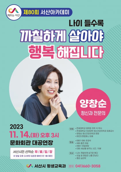 [충청뉴스큐] 충남 서산시가 14일 오후 3시 문화회관 대공연장에서 양창순 박사를 초청해‘제80회 서산아카데미’를 개최한다고 밝혔다.