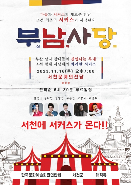 [충청뉴스큐] 서천군이 군민들의 문화향유권과 문화접근성을 개선하기 위해 다가오는 수능일인 11월 16일 저녁 7시에 서천 문예의 전당에서 “조선 최초 서커스 부남사당”공연을 운영한다고 밝혔다.