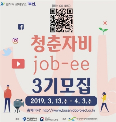 [충청뉴스큐] 부산시는 민선 7기 일자리시책을 시민들이 체감할 수 있도록 홍보하기 위해 청년들로 구성된 ‘제3기 청춘자비’ 서포터즈를 오는 4월 3일 오후 6시까지 모집한다고 밝혔다.
