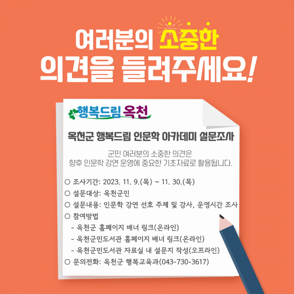 [충청뉴스큐] 옥천군은 내년도 행복드림 인문학 아카데미 사업을 내실 있게 추진하기 위해 오는 30일까지 주민 의견을 받는다고 밝혔다.