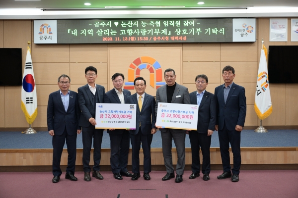 논산시 농축협과 공주시 농축협에서는 지난 9월부터 뜻을 합쳐 고향사랑기부금을 모아 왔으며 13일 기탁식을 열고 ‘논산은 공주에, 공주는 논산으로’의 상호 나눔을 완료했다.