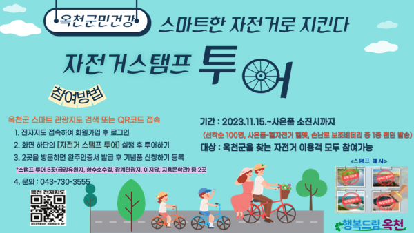 [충청뉴스큐] 옥천군은 관내 관광지와 스마트 관광전자지도를 활용한 ‘자전거 스탬프 투어’를 15일부터 운영한다.