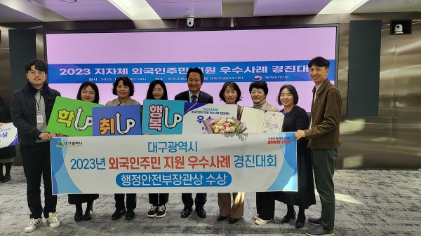 [충청뉴스큐] 대구광역시는 21일 행정안전부 주관 ‘2023년 전국 외국인주민 지원 우수사례 경진대회’에서 ‘결혼이민자 인재양성 - 모국에서 못다 한 공부 한국에서 이어가요’ 사례로 우수상을 차지해 특별교부세 6천만원을 받게 됐다.