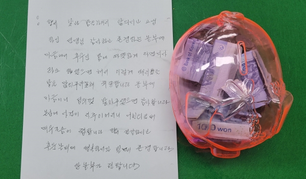 이후 지구대 경찰관이 울타리를 확인했으나 사람은 없었고 녹색 종이가방만이 있었으며 가방에는 돼지저금통 한 개와 편지지가 들어 있었다.