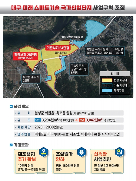 올해 3월 15일 달성군 화원읍~옥포읍 일원 3,294천㎡ 규모 제2국가산단 후보지 선정 이후 대구광역시와 사업시행예정자는 우수한 역외기업 유치를 위해서 조성원가 인하 방안 마련과 제조용지 추가 확보가 필요하다고 판단하고 사업구역 조정 방안을 지속적으로 논의해 왔다.