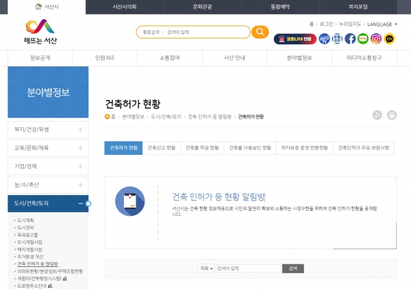 관련 정보는 서산시청 누리집에 접속 후 ‘분야별 정보 >도시/건축/토지 >건축 인허가 등 알림방’ 항목에서 누구나 확인할 수 있다.