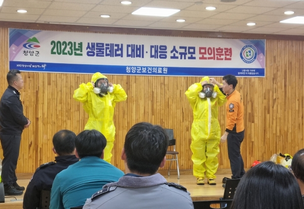 [충청뉴스큐] 청양군보건의료원이 지난 23일 보건의료원 대회의실에서 생물테러에 대비한 소규모 모의훈련을 실시했다.