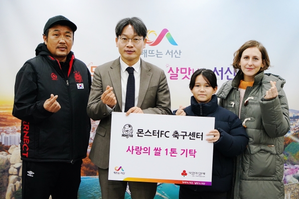 이날 서산시청 상황실에서 열린 기탁식에는 구상 서산시 부시장, 김남하 몬스터FC 축구센터 센터장 부부와 자녀가 참석했다.
