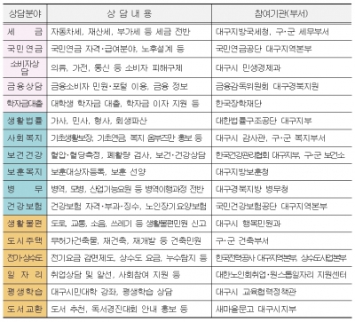 대구시와 8개 구·군을 비롯해 대구지방국세청, 대구경북지방병무청 등 17개 유관기관 60여 명으로 운영하는 상담반에는 각 기관에서 가장 우수한 직원들이 파견되어 시민들의 불편과 애로사항을 해소하기 위해 상담에 열과 성을 다하고 있다.