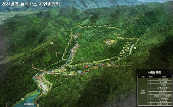 청산별곡 르네상스 자연휴양림 조성사업은 옥천군 청산면 명티리 산21-17일원 635,129㎡ 규모의 군유림 등 산림자원을 활용해 숲속의 집과 트리하우스, 산림휴양관, 숲속야영장, 숲길 등을 조성하는 사업이다.