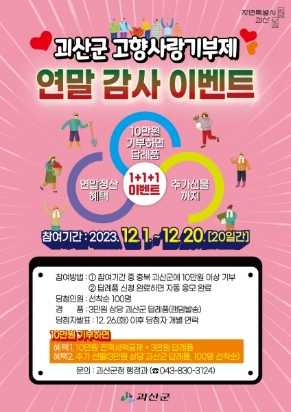 [충청뉴스큐] 충북 괴산군은 오는 20일까지 고향사랑기부제 연말 감사 이벤트를 진행한다고 밝혔다.