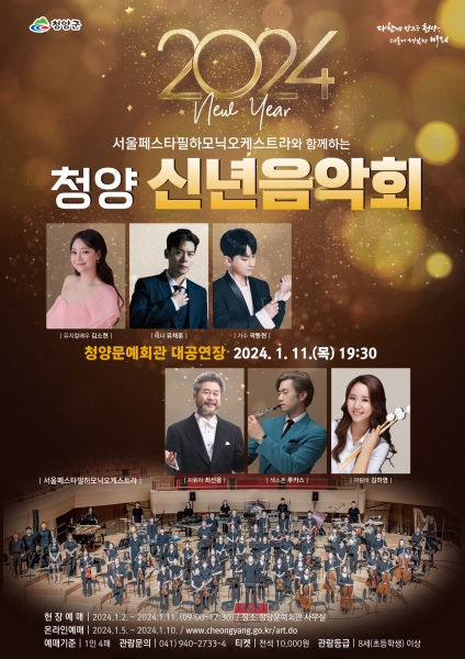 [충청뉴스큐] 청양군이 1월 11일 저녁 7시 30분 청양문화예술회관 대공연장에서 2024년 희망의 새해를 여는 신년 음악회를 개최한다.