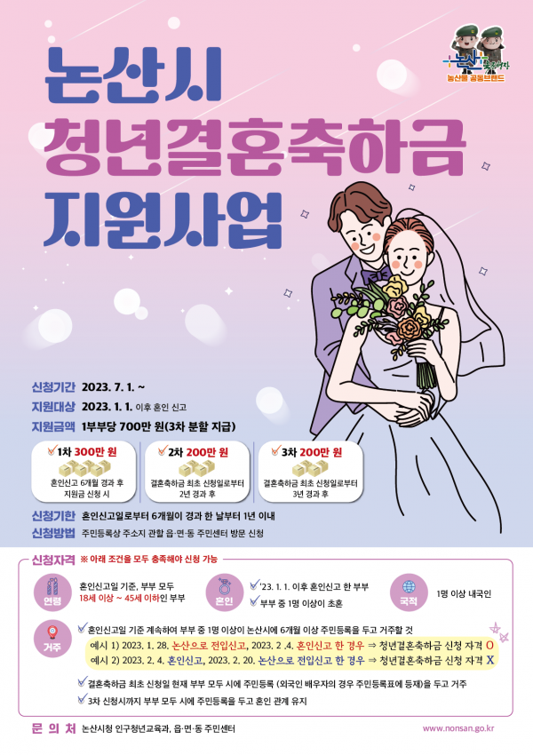 [충청뉴스큐] 논산시는 청년부부의 결혼 초기 경제적 부담을 완화하고 지역 내 안정적인 정착을 돕기 위해 청년 결혼축하금 지원사업을 운영하고 있다.