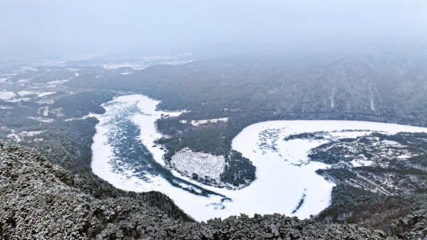 산막이옛길 인근 등잔봉을 오르면 눈꽃이 가득한 괴산호 내 한반도 지형도 감상할 수 있다.
