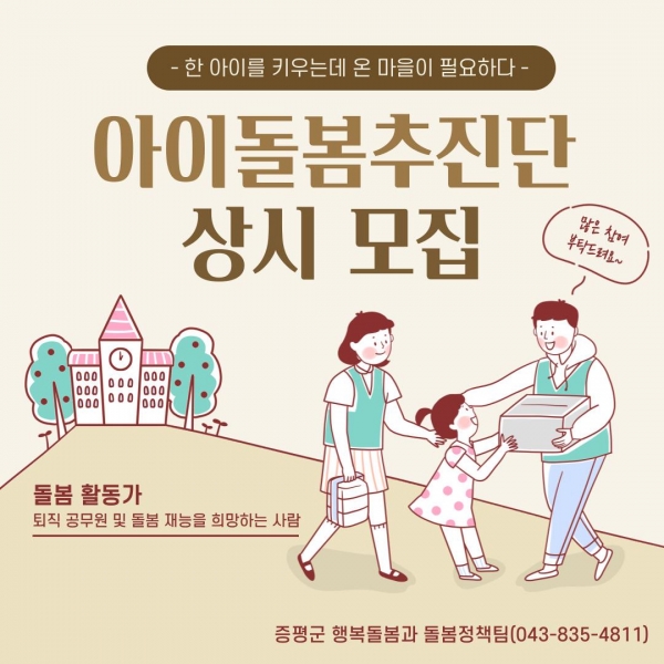 이에 따라, 군은 15일부터 돌봄활동가, 돌봄홍보단, 돌봄자문단 3개 분야로 구성된 ‘아이돌봄추진단’을 모집한다.