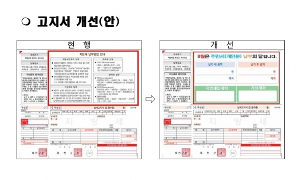 김동산 세정과장은 “고지서 읽기가 불편한 군민들을 위해 지방세 고지서 서식을 개선했다 앞으로도 납세자가 쉽고 간편하게 세금을 신고 납부할 수 있도록 세정서비스 향상에 노력하겠다”고 말했다.