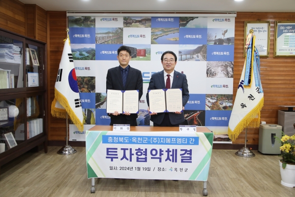 충청북도·옥천군·지에프엠티는 지난 19일 옥천군청 군수실에서 황규철 옥천군수, ㈜지에프엠티 이화랑 대표 및 관계자들이 참석한 가운데 옥천테크노밸리 산업단지에 대한 투자협약을 체결했다.