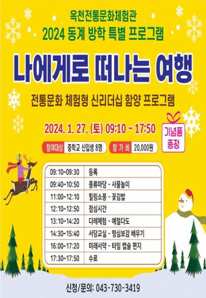 [충청뉴스큐] 옥천군은 신년 새 학기를 맞아 옥천전통문화체험관에서 ‘나에게로 떠나는 여행’ 특별 프로그램을 운영한다.