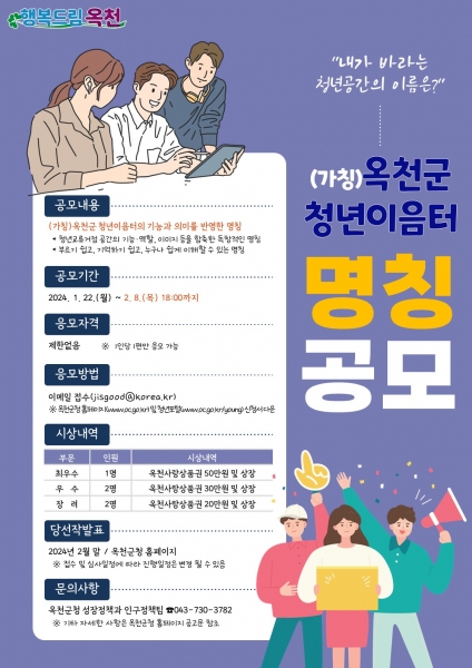 옥천군 성장정책과 관계자는 “명칭 공모전을 통해 옥천군에 청년을 위한 공간이 새롭게 조성됨을 대내외적으로 알리고 옥천군 청년공간의 상징성과 비전을 담은 누구나 사용하기 쉬운 명칭이 선정될 수 있도록 주민 여러분의 많은 관심과 참여를 바란다”고 말했다.