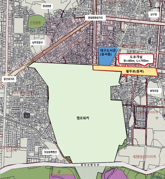 [충청뉴스큐] 대구광역시는 캠프워커 부지로 인해 단절된 3차 순환도로를 연결해 도심 간 접근성을 높이고 교통정체를 해소하고자 영대네거리 남편과 봉덕초교 구간을 연결하는 왕복 8차선 도로 건설공사를 2월 착공할 예정이다.