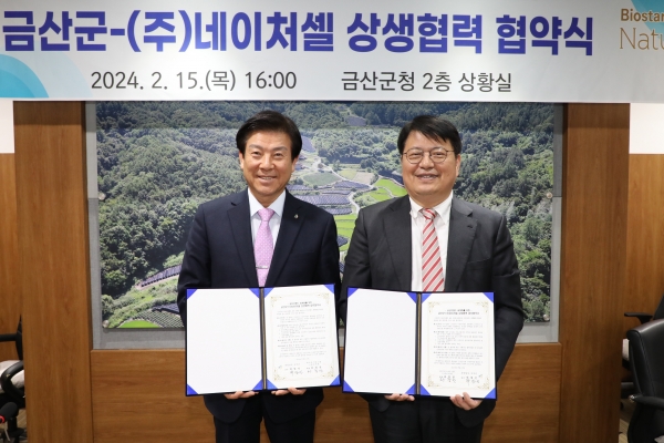 [충청뉴스큐] 금산군은 지난 15일 금산군청에서 ㈜네이처셀과 금산브랜드 세계화를 위해 상생협력 협약을 체결했다.