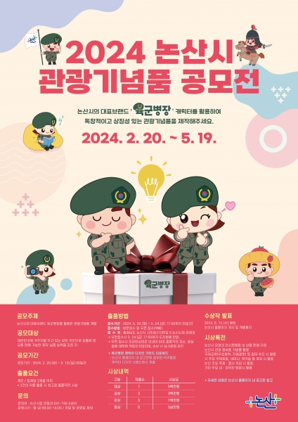 [충청뉴스큐] 충남 논산시는 시 대표브랜드인 육군병장을 활용한 독창적이고 상징성 있는 관광기념품을 발굴하고 국방·군수산업 중심 도시로서의 위상을 높이기 위해 ‘논산시 관광기념품 공모전’을 개최한다고 19일 밝혔다.
