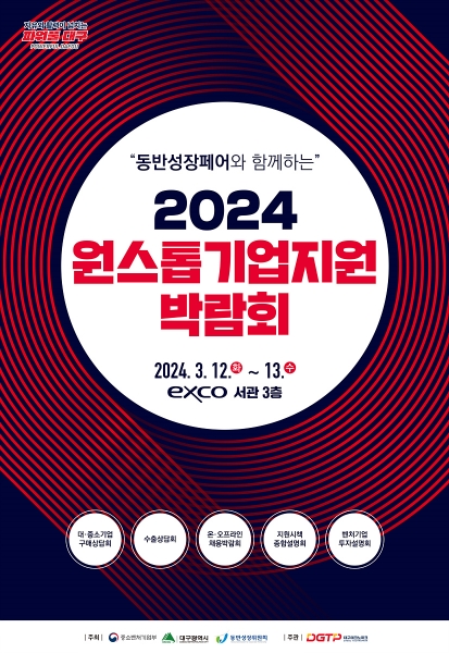 [충청뉴스큐] 대구광역시는 지역기업의 내수, 수출, 자금, 인력 등 애로 해결을 위해 3월 12일부터 13일까지 엑스코에서 개최되는 ‘2024 원스톱기업지원박람회’ 참여기업을 모집한다.