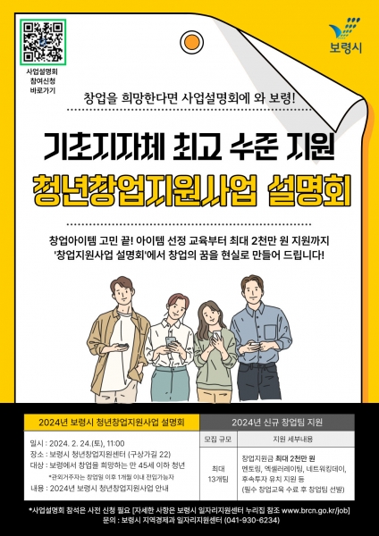 이번 사업설명회는 창업에 관심 있는 만 18세 이상 만 45세 이하 청년이라면 누구나 참여 가능하며 보령시 청년창업 지원사업에 대한 사업 추진 체계와 세부적인 사업 내용에 대해 안내할 예정이다.