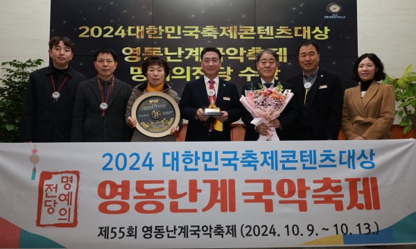 정영철 영동군수는 “영동난계국악축제의 진가를 인정받음과 동시에, 2025년 영동세계국악엑스포의 개최 앞두고 받은 큰 상이라 각별한 의미를 지닌다”며 “세계국악엑스포의 성공적인 개최는 영동뿐만 아니라 대한민국의 자존심이 걸린 일이니, 전 국민의 관심과 성원을 부탁드린다“라고 말했다.