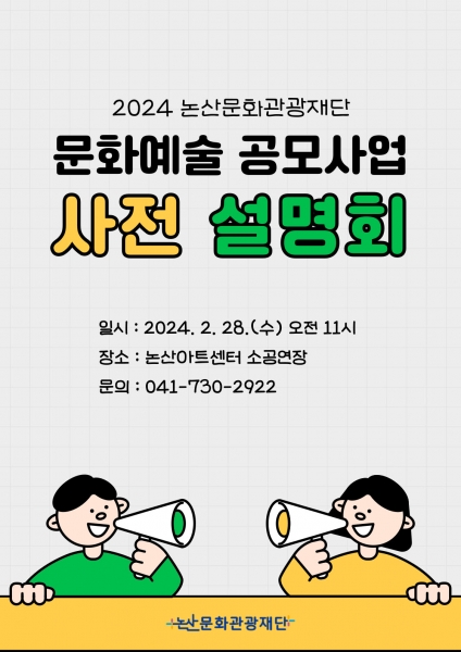 [충청뉴스큐] 논산문화관광재단이 오는 28일 오전 11시 논산아트센터 소공연장에서 ‘2024 논산문화관광재단 문화예술 공모사업 사전 설명회’를 개최한다.