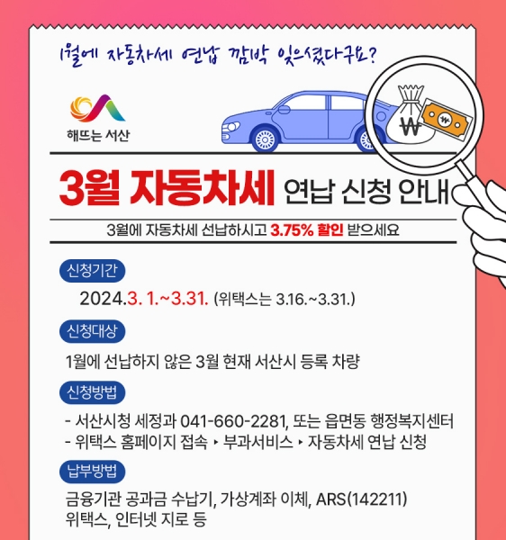 [충청뉴스큐] 충남 서산시가 자동차세 3월 연납 신청을 통한 3.75% 절세 혜택을 강조했다.