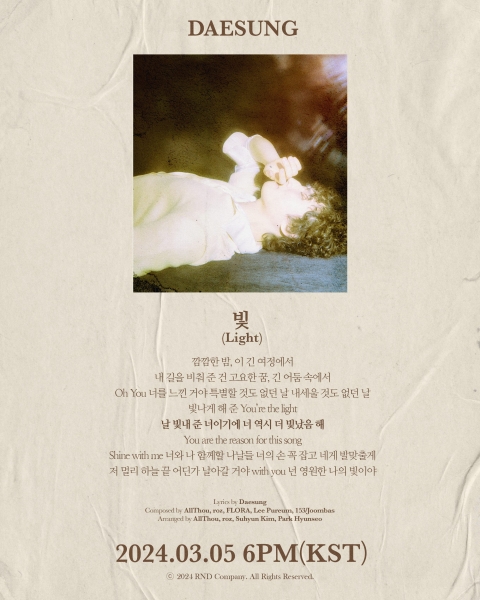 공개된 리릭 포스터에는 신곡 ‘빛’의 가사 일부와 대성의 모습이 담겨있다.