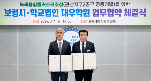 [충청뉴스큐] 보령시는 학교법인 대우학원과 지난 4일 시청 상황실에서 김동일 시장, 김선용 대우학원 이사장, 이수훈 아주자동차대학교 총장 등이 참석한 가운데 바이오에너지 분야 녹색융합클러스터 조성을 위한 관산지구 2공구 공동개발에 관한 업무협약을 체결했다.