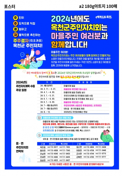 [충청뉴스큐] 옥천군 9개 읍·면 주민자치회는 마을의 현안 해결과 지역발전을 위한 다양한 마을사업 추진의 근간이 되는‘마을의제 주민제안’을 접수한다.