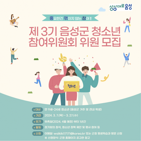 [충청뉴스큐] 음성군은 ‘제3기 음성군 청소년참여위원회’ 위원을 3월 27일까지 공개 모집한다고 밝혔다.