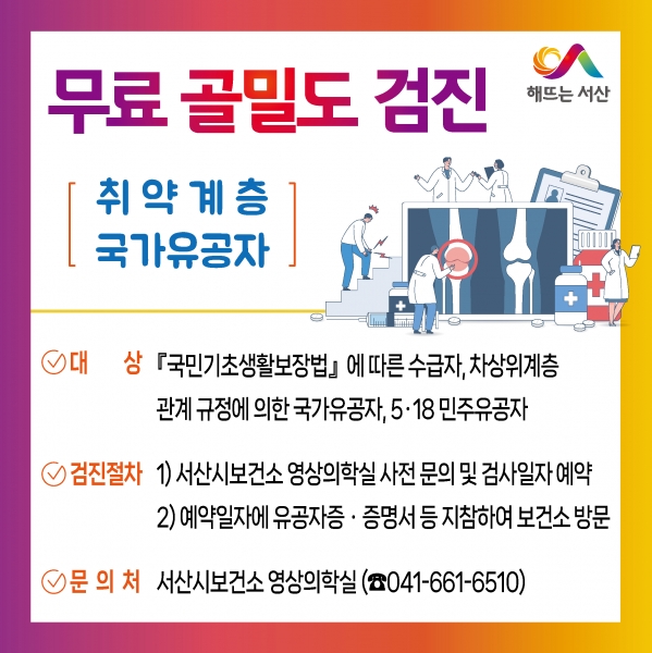 [충청뉴스큐] 충남 서산시가 11일 시민의 뼈 건강 사수를 위해 무료 골밀도 검진사업을 연중 추진한다.