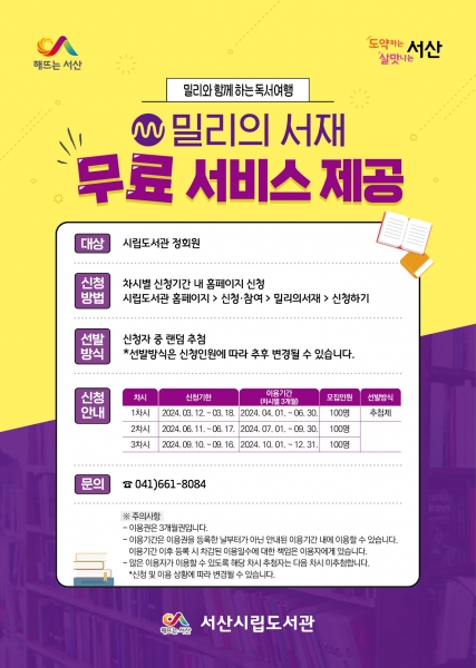 신청 일정은 1~3차시로 구성되며 1차시 신청 기간은 12일~18일까지, 2차시와 3차시는 각각 6월 11일~17일 9월 10일~16일에 서산시립도서관 누리집 ‘밀리의 서재’ 게시판에서 신청할 수 있다.