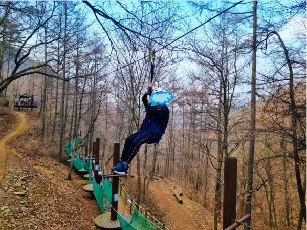 산림레포츠 시설인 좌구산줄타기는 총길이 1.2Km로 높은 곳에서 하강하는 짜릿함과 시원함을 느낄 수 있다.