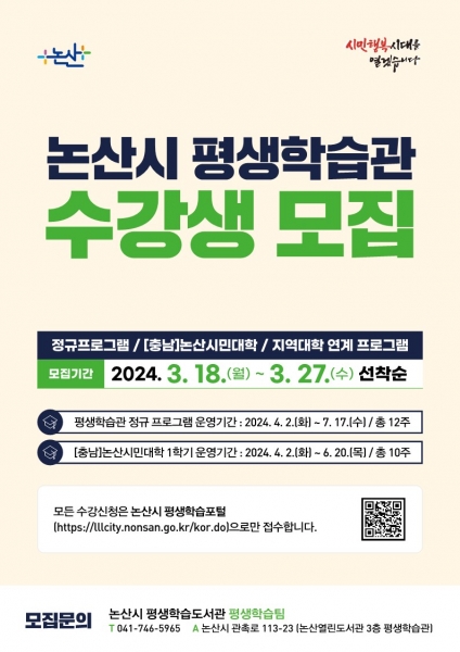 [충청뉴스큐] 논산시가 오는 18일부터 27일까지 ‘2024년 논산시 평생학습관 상반기 프로그램’ 수강생을 선착순 모집한다.