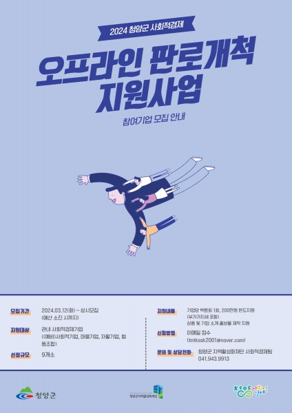 [충청뉴스큐] 청양군이 2024년 사회적경제 오프라인 판로개척 지원사업 참여기업을 예산 소진 시까지 상시 모집한다고 15일 밝혔다.