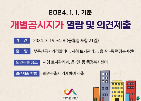 [충청뉴스큐] 충남 서산시가 2024년 1월 1일 기준 산정한 33만 3백 필지의 개별공시지가에 대해 19일부터 4월 8일까지 소유자 의견 접수를 진행한다고 밝혔다.