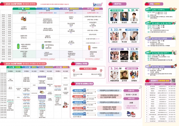 시 관계자는 “논산시민과 딸기축제 방문객의 원활한 관람을 위해 주차면과 순환버스 운행을 확충했다”며“가급적 순환버스 이용을 통해, 교통혼잡으로 인한 관람 지연과 인근 상인들의 영업피해가 최소화될 수 있도록 협조해 주시길 바란다”고 당부했다.