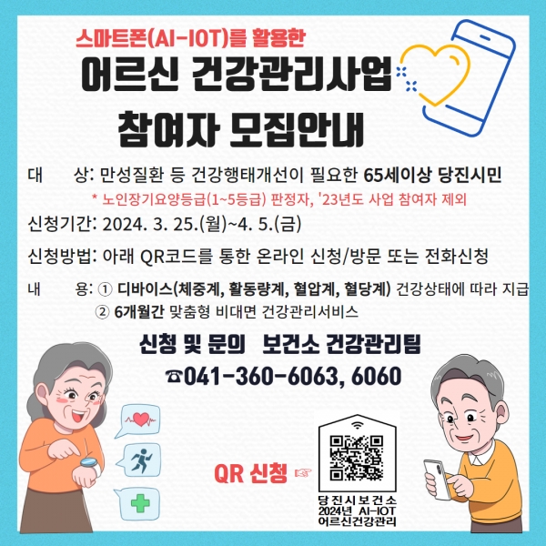[충청뉴스큐] 당진시보건소는 오는 25일부터 4월 5일까지 어르신 건강관리사업 참여자 560명을 선착순 모집한다.