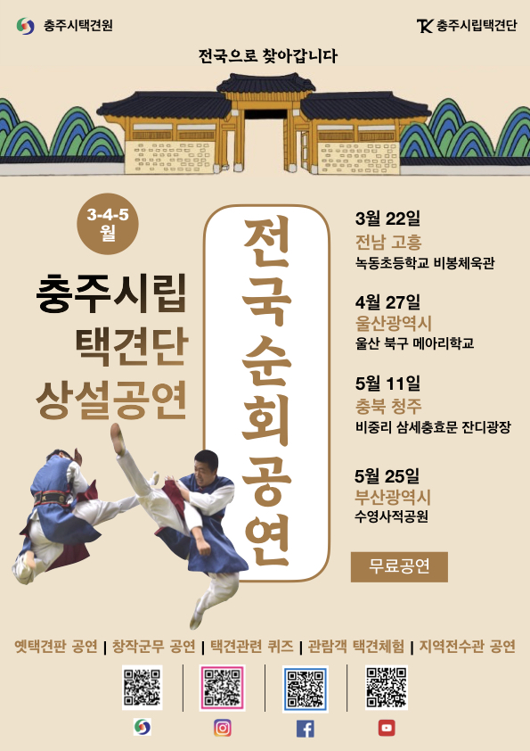 충주시립택견단은 3월 22일 전남 고흥을 시작으로 매월 울산, 부산 등 전국 각지로 직접 찾아가 다채로운 택견 공연을 펼치고 관객과 함께하는 체험 프로그램을 운영한다.