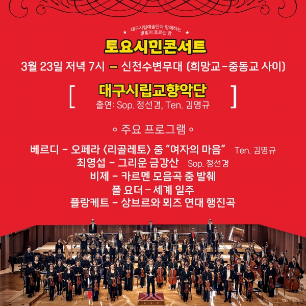 [충청뉴스큐] 대구광역시는 대구시립예술단의 일상생활 속 시민과 함께 하는 공연을 통해 시민에게 즐거움을 선사하고 문화와 예술로 지역에 활력을 부여하기 위한 ‘토요시민콘서트’의 첫 공연을 3월 23일 오후 7시, 신천 수변무대와 동성로 관광안내소 앞에서 동시에 펼친다.