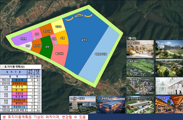 세부적으로는 약 250만㎡의 부지에 골프장, 아웃렛, 의료·문화 등이 복합된 하이엔드 시니어 메디타운, 반려동물 테마공원, 펫거리, 호텔, 리조트, 상업시설 등 수요자 맞춤형 특화개발을 통해 경쟁력을 높였으며 대구광역시 및 구·군 공무원 약 1만 4천 명의 교육과 복지를 담당하는 공무원 연수시설과 숙박·스포츠·문화 등이 복합된 민간 연수시설 건립을 함께 추진해 ‘TK신공항 건설에 따른 공동합의문’ 합의사항을 이행함과 동시에 대구은행을 비롯한 기업 연수시설을 유치해 복합레저단지 개발의 시너지 효과를 내고자 했다.