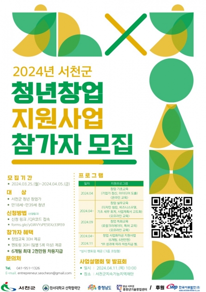 [충청뉴스큐] 서천군이 다음달 5일까지 예비창업자 및 창업에 관심 있는 청년들을 대상으로 ‘청년창업 지원사업’ 참여자를 모집한다.