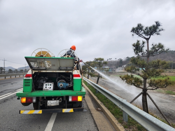 이번 살포 대상 수목은 태안 방면의 국도 32호선 내 식재된 소나무 가로수 약 1,400주로 시는 염분 중화제를 100배 희석해 가로수 잎 표면과 줄기에 살포하고 오염 물질 등을 제거할 예정이다.