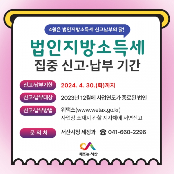 [충청뉴스큐] 충남 서산시가 2023년 귀속 소득에 대한 법인지방소득세 집중 신고 기간을 4월 30일까지 운영한다고 밝혔다.