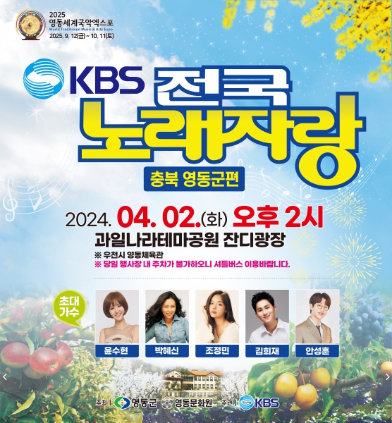 영동군은 2일 오후 2시 과일나라 테마공원에서 ‘KBS 전국노래자랑’ 영동군편을 공개 녹화한다고 밝혔다.